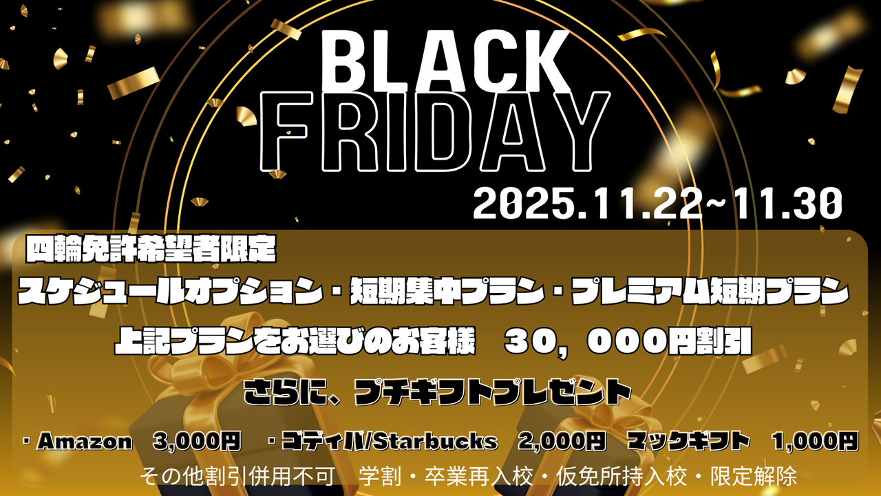 四輪免許を希望されるお客様で、スケジュールプラン・短期集中プラン・プレミアムプランを選ばれたお客様はお値引き+ブラックギフトをプレゼント。