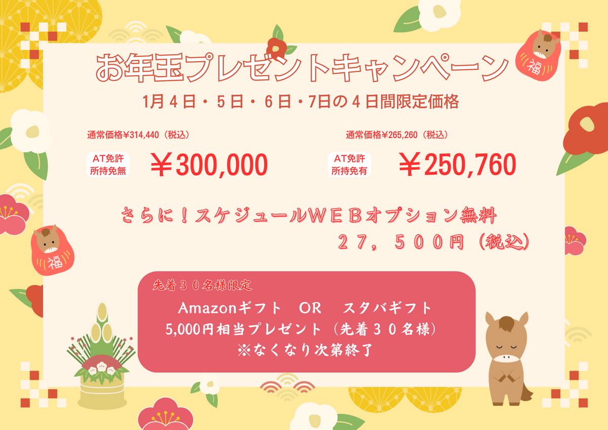 所持免許無・新規普通自動車免許でご入校のお客様へ Amazon or スタバギフト5,000円相当プレゼント!